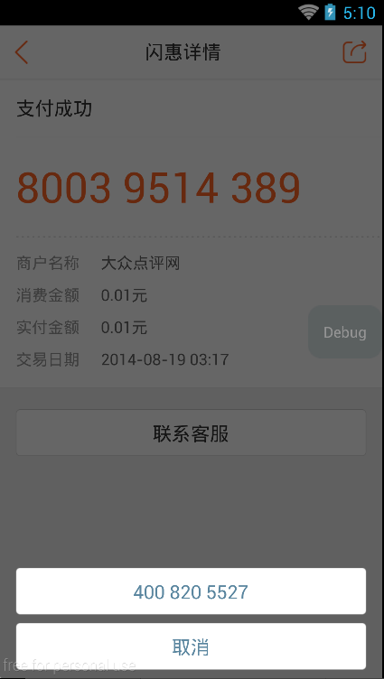 1 private void showDialCustomerService() { 2 final Dialog dlg = new Dialog(PhonePayDetail.this); 3 dlg.requestWindowFeature(Window.FEATURE_NO_TITLE); 4 dlg.setContentView(R.layout.huihui_bottom_dialog); 5 6 Button dialPhone = (Button) dlg.findViewById(R.id.customer_service_phone); 7 dialPhone.setOnClickListener(new OnClickListener() { 8 @Override 9 public void onClick(View v) { 10 Uri uri = Uri.parse("tel:4008205527"); // DP customer service 11 // number 12 Intent dialIntent = new Intent(Intent.ACTION_DIAL, uri); 13 startActivity(dialIntent); 14 dlg.dismiss(); 15 } 16 }); 17 18 Button dial = (Button) findViewById(R.id.dial_customer_service); 19 dial.setOnClickListener(new OnClickListener() { 20 @Override 21 public void onClick(View v) { 22 dlg.show(); 23 } 24 }); 25 26 Button cancel = (Button) dlg.findViewById(R.id.cancel); 27 cancel.setOnClickListener(new OnClickListener() { 28 @Override 29 public void onClick(View v) { 30 dlg.dismiss(); 31 } 32 }); 33 34 // set width, cause set dialog width to match_parent in xml doesn't work 35 dlg.getWindow().setLayout(LayoutParams.MATCH_PARENT, LayoutParams.WRAP_CONTENT); 36 37 // set background transparent 38 dlg.getWindow().setBackgroundDrawableResource(R.color.transparent); 39 40 // sink to bottom 41 WindowManager.LayoutParams windowLayoutParam = dlg.getWindow().getAttributes(); 42 windowLayoutParam.gravity = Gravity.BOTTOM; 43 }