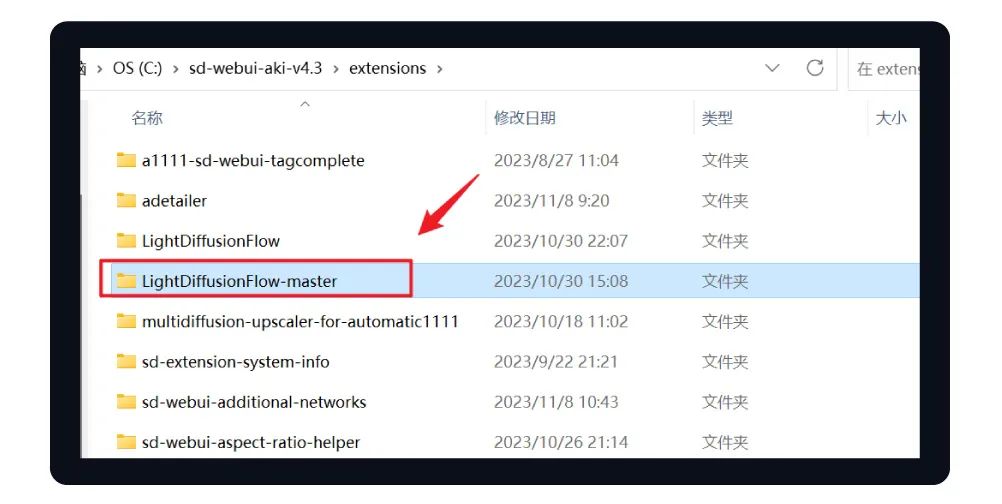 ②解压安装包,将里面的 LightDiffusionFlow-master 文件夹整个放入根目录的「Extensions」文件夹中,然后重新启动 WebUI,进入后就能看到插件界面了。