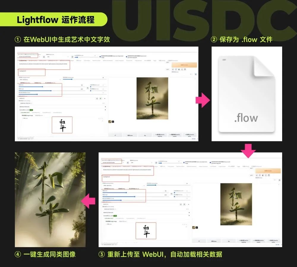 LightFlow 则可以一键保存所有生成数据,让工作流被完整复现。下图是官方给出的插件运作示意图,当我们在 WebUI 中生成一张图像后,用 LightFlow 插件将所有的数据导出为一个. flow 文件。之后只要再次上传这个文件,相关的参数就会自动加载,其中包括大模型选择、垫图和第三方插件的设置信息。