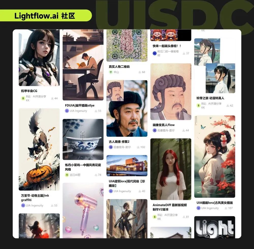 Lightflow 还有一个开源社区,里面有很多大神分享的优质工作流,比如艺术二维码、古人画像转真人、建筑照片转手绘线稿以及各种艺术字特效。选个一个你喜欢的图像,进入详情页下载它的 Lightflow 文件,上传到你的 WebUI Lightflow 插件中,就能轻松生成同类图像了。