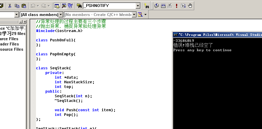 1 //异常处理的过程主要有三个步骤 2 //抛出异常、捕捉异常和处理异常 3 #include<iostream.h> 4 5 class PushOnFull{ 6 }; 7 8 class PopOnEmpty{ 9 }; 10 11 class SeqStack{ 12 private: 13 int *data; 14 int MaxStackSize; 15 int top; 16 public: 17 SeqStack(int n); 18 ~SeqStack(); 19 20 void Push(const int item); 21 int Pop(); 22 }; 23 24 SeqStack::SeqStack(int n){ 25 top=0; 26 MaxStackSize=n; 27 data=new int[n]; 28 } 29 30 SeqStack::~SeqStack(){ 31 delete data; 32 } 33 34 void SeqStack::Push(const int item){ 35 if(this->top==this->MaxStackSize) 36 throw PushOnFull();//抛出异常 37 38 data[top]=item; 39 top++; 40 } 41 42 int SeqStack::Pop(){ 43 if(top==-1){//这里有个疑问,top==-1还是top==0合适 44 throw PopOnEmpty(); 45 } 46 top--; 47 return data[top]; 48 } 49 50 int main(){ 51 SeqStack myStack(10); 52 // try{ 53 // for(int i=0;i<11;i++){ 54 // myStack.Push(i); 55 // } 56 // }catch(PushOnFull){ 57 // cout<<"错误!堆栈已经满了"<<endl; 58 // } 59 60 try{ 61 for(int i=0;i<11;i++){ 62 cout<<myStack.Pop()<<endl; 63 } 64 }catch(PopOnEmpty){ 65 cout<<"错误!堆栈已经空了"<<endl; 66 } 67 return 0; 68 }