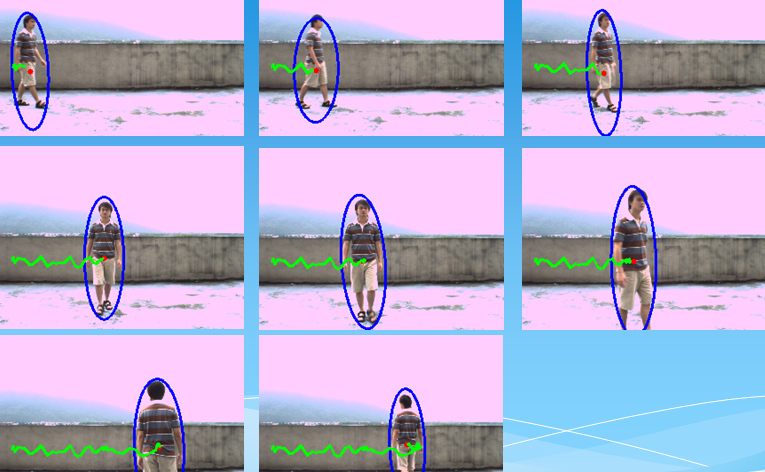 #include "opencv2/opencv.hpp" #include<iostream> using namespace std; using namespace cv; Point center; Point fre_center;//存储前一帧中心坐标 int num=0; vector<Point> points; Mat MoveDetect(Mat background, Mat img) { Mat result = img.clone(); Mat gray1, gray2; cvtColor(background, gray1, CV_BGR2GRAY); cvtColor(img, gray2, CV_BGR2GRAY); Mat diff; absdiff(gray1, gray2, diff); imshow("absdiss", diff); threshold(diff, diff, 45, 255, CV_THRESH_BINARY); imshow("threshold", diff); Mat element = getStructuringElement(MORPH_RECT, Size(1, 1)); Mat element2 = getStructuringElement(MORPH_RECT, Size(9, 9)); erode(diff, diff, element); imshow("erode", diff); dilate(diff, diff, element2); imshow("dilate", diff); vector<vector<Point>> contours; vector<Vec4i> hierarcy; findContours(diff, contours, hierarcy, CV_RETR_EXTERNAL, CHAIN_APPROX_NONE); //查找轮廓 vector<Rect> boundRect(contours.size()); //定义外接矩形集合 //drawContours(img2, contours, -1, Scalar(0, 0, 255), 1, 8); //绘制轮廓 vector<RotatedRect> box(contours.size()); int x0=0, y0=0, w0=0, h0=0; for(int i=0; i<contours.size(); i++) { boundRect[i] = boundingRect((Mat)contours[i]); //查找每个轮廓的外接矩形 x0 = boundRect[i].x; //获得第i个外接矩形的左上角的x坐标 y0 = boundRect[i].y; //获得第i个外接矩形的左上角的y坐标 w0 = boundRect[i].width; //获得第i个外接矩形的宽度 h0 = boundRect[i].height; //获得第i个外接矩形的高度 if(w0>30 && h0>30)//筛选长宽大于30的轮廓 { num++; //rectangle(result, Point(x0, y0), Point(x0+w0, y0+h0), Scalar(0, 255, 0), 2, 8); //绘制第i个外接矩形 box[i] = fitEllipse(Mat(contours[i])); ellipse(result, box[i], Scalar(255, 0, 0), 2, 8); //椭圆轮廓 circle(result, box[i].center, 3, Scalar(0, 0, 255), -1, 8); //画中心 center = box[i].center;//当前帧的中心坐标 points.push_back(center);//中心塞进points向量集 if(num !=1) { //line(result, fre_center, center, Scalar(255, 0, 0), 2, 8); for(int j=0; j<points.size()-1; j++) line(result, points[j], points[j+1], Scalar(0, 255, 0), 2, 8); } //fre_center = center; } } return result; } void main() { VideoCapture cap("E://man.avi"); if(!cap.isOpened()) //检查打开是否成功 return; Mat frame; Mat background; Mat result; int count=0; while(1) { cap>>frame; if(!frame.empty()) { count++; if(count==1) background = frame.clone(); //提取第一帧为背景帧 imshow("video", frame); result = MoveDetect(background, frame); imshow("result", result); if(waitKey(30)==27) break; } else break; } cap.release(); }