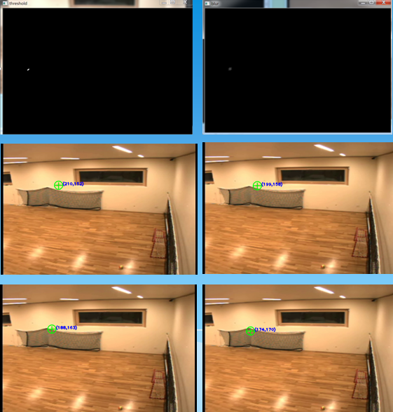 #include "opencv2/opencv.hpp" #include<iostream> using namespace std; using namespace cv; //int to string helper function string intToString(int number) { stringstream ss; ss << number; return ss.str(); } Mat MoveDetect(Mat background, Mat img) { Mat result = img.clone(); Mat gray1, gray2; cvtColor(background, gray1, CV_BGR2GRAY); cvtColor(img, gray2, CV_BGR2GRAY); Mat diff; absdiff(gray1, gray2, diff); threshold(diff, diff, 20, 255, CV_THRESH_BINARY); imshow("threshold", diff); blur(diff, diff, Size(10, 10));//均值滤波 imshow("blur", diff); vector<vector<Point>> contours; vector<Vec4i> hierarcy; findContours(diff, contours, hierarcy, CV_RETR_EXTERNAL, CHAIN_APPROX_NONE); //查找轮廓 vector<Rect> boundRect(contours.size()); //定义外接矩形集合 //drawContours(img2, contours, -1, Scalar(0, 0, 255), 1, 8); //绘制轮廓 int x0=0, y0=0, w0=0, h0=0; for(int i=0; i<contours.size(); i++) { boundRect[i] = boundingRect((Mat)contours[i]); //查找每个轮廓的外接矩形 x0 = boundRect[i].x; //获得第i个外接矩形的左上角的x坐标 y0 = boundRect[i].y; //获得第i个外接矩形的左上角的y坐标 w0 = boundRect[i].width; //获得第i个外接矩形的宽度 h0 = boundRect[i].height; //获得第i个外接矩形的高度 //rectangle(result, Point(x0, y0), Point(x0+w0, y0+h0), Scalar(0, 255, 0), 2, 8); //绘制第i个外接矩形 circle(result, Point(x0+w0/2, y0+h0/2), 15, Scalar(0, 255, 0), 2, 8); line(result, Point(x0+w0/2-15, y0+h0/2), Point(x0+w0/2+15, y0+h0/2), Scalar(0, 255, 0), 2, 8); line(result, Point(x0+w0/2, y0+h0/2-10), Point(x0+w0/2, y0+h0/2+15), Scalar(0, 255, 0), 2, 8); putText(result,"(" + intToString(x0+w0/2)+","+intToString(y0+h0/2)+")",Point(x0+w0/2+15, y0+h0/2), 1, 1,Scalar(255,0,0),2); } return result; } void main() { VideoCapture cap("E://ball.avi"); if(!cap.isOpened()) //检查打开是否成功 return; Mat frame; Mat result; Mat background; int count=0; while(1) { cap>>frame; if(frame.empty()) break; else{ count++; if(count==1) background = frame.clone(); //提取第一帧为背景帧 imshow("video", frame); result = MoveDetect(background, frame); imshow("result", result); if(waitKey(50)==27) break; } } cap.release(); }