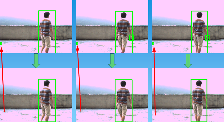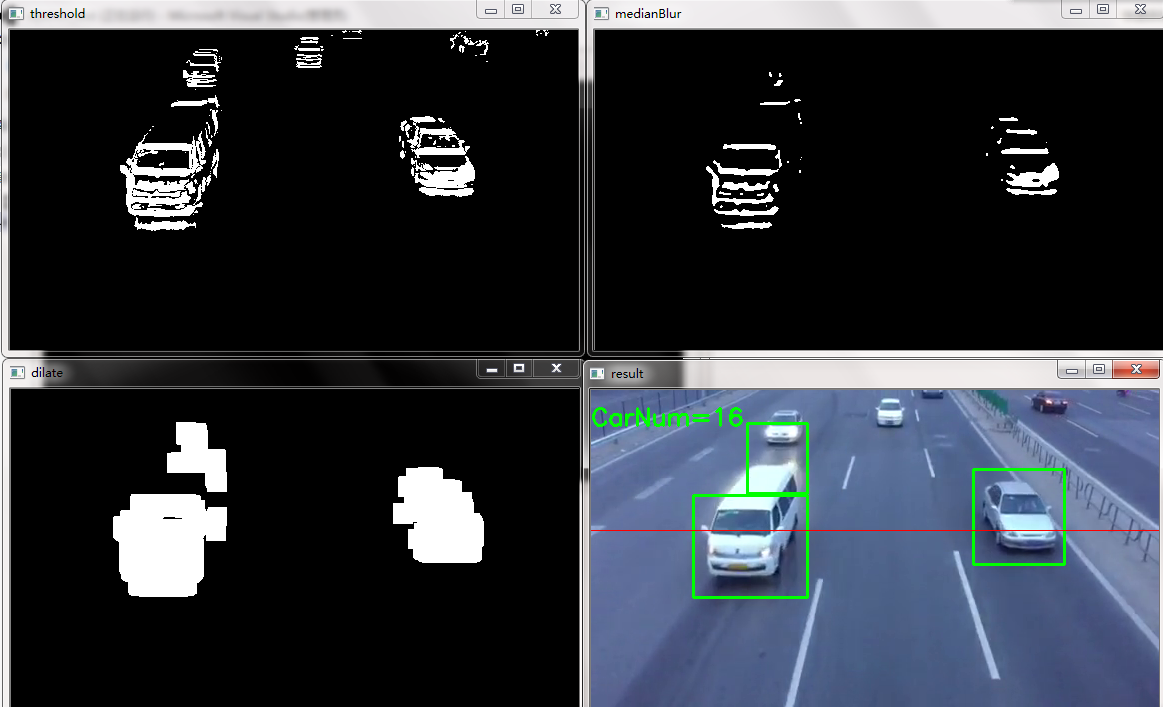 1 #include "opencv2/opencv.hpp" 2 #include<iostream> 3 using namespace std; 4 using namespace cv; 5 6 int CarNum = 0; 7 //int to string helper function 8 string intToString(int number) 9 { 10 //this function has a number input and string output 11 stringstream ss; 12 ss << number; 13 return ss.str(); 14 } 15 16 Mat MoveDetect(Mat frame1, Mat frame2) { 17 Mat result = frame2.clone(); 18 Mat gray1, gray2; 19 cvtColor(frame1, gray1, CV_BGR2GRAY); 20 cvtColor(frame2, gray2, CV_BGR2GRAY); 21 22 Mat diff; 23 absdiff(gray1, gray2, diff); 24 //imshow("absdiss", diff); 25 threshold(diff, diff, 25, 255, CV_THRESH_BINARY); 26 imshow("threshold", diff); 27 28 Mat element = getStructuringElement(MORPH_RECT, Size(3, 3)); 29 Mat element2 = getStructuringElement(MORPH_RECT, Size(19, 19)); 30 erode(diff, diff, element); 31 //imshow("erode", dst); 32 medianBlur(diff, diff, 3); 33 imshow("medianBlur", diff); 34 dilate(diff, diff, element2); 35 imshow("dilate", diff); 36 37 vector<vector<Point>> contours; 38 vector<Vec4i> hierarcy; 39 findContours(diff, contours, hierarcy, CV_RETR_EXTERNAL, CV_CHAIN_APPROX_SIMPLE, Point(0, 0));//查找轮廓 40 vector<vector<Point>>contours_poly(contours.size()); 41 vector<Rect> boundRect(contours.size()); //定义外接矩形集合 42 //drawContours(img2, contours, -1, Scalar(0, 0, 255), 1, 8); //绘制轮廓 43 int x0 = 0, y0 = 0, w0 = 0, h0 = 0; 44 for (int i = 0; i<contours.size(); i++) 45 { 46 approxPolyDP(Mat(contours[i]), contours_poly[i], 3, true);//对图像轮廓点进行多边形拟合:轮廓点组成的点集,输出的多边形点集,精度(即两个轮廓点之间的距离),输出多边形是否封闭 47 boundRect[i] = boundingRect(Mat(contours_poly[i])); 48 if (boundRect[i].width>55 && boundRect[i].width<180 && boundRect[i].height>55 && boundRect[i].height<180) {//轮廓筛选 49 x0 = boundRect[i].x; 50 y0 = boundRect[i].y; 51 w0 = boundRect[i].width; 52 h0 = boundRect[i].height; 53 54 rectangle(result, Point(x0, y0), Point(x0 + w0, y0 + h0), Scalar(0, 255, 0), 2, 8, 0); 55 if ((y0 + h0 / 2 + 1) >= 138 && (y0 + h0 / 2 - 1) <= 142) {//经过这条线(区间),车辆数量+1 56 CarNum++; 57 } 58 } 59 line(result, Point(0, 140), Point(568, 140), Scalar(0, 0, 255), 1, 8);//画红线 60 Point org(0, 35); 61 putText(result, "CarNum=" + intToString(CarNum), org, CV_FONT_HERSHEY_SIMPLEX, 0.8f, Scalar(0, 255, 0), 2); 62 } 63 return result; 64 } 65 66 void main() 67 { 68 VideoCapture cap("E://2.avi"); 69 if (!cap.isOpened()) //检查打开是否成功 70 return; 71 Mat frame; 72 Mat tmp; 73 Mat result; 74 int count = 0; 75 while (1) 76 { 77 cap >> frame; 78 if(frame.empty())//检查视频是否结束 79 break; 80 else{ 81 count++; 82 if (count == 1) 83 result = MoveDetect(frame, frame); 84 else result = MoveDetect(tmp, frame); 85 imshow("video", frame); 86 imshow("result", result); 87 tmp = frame.clone(); 88 if (waitKey(20) == 27) 89 break; 90 } 91 } 92 cap.release(); 93 }