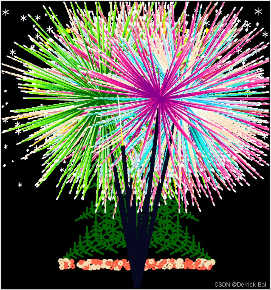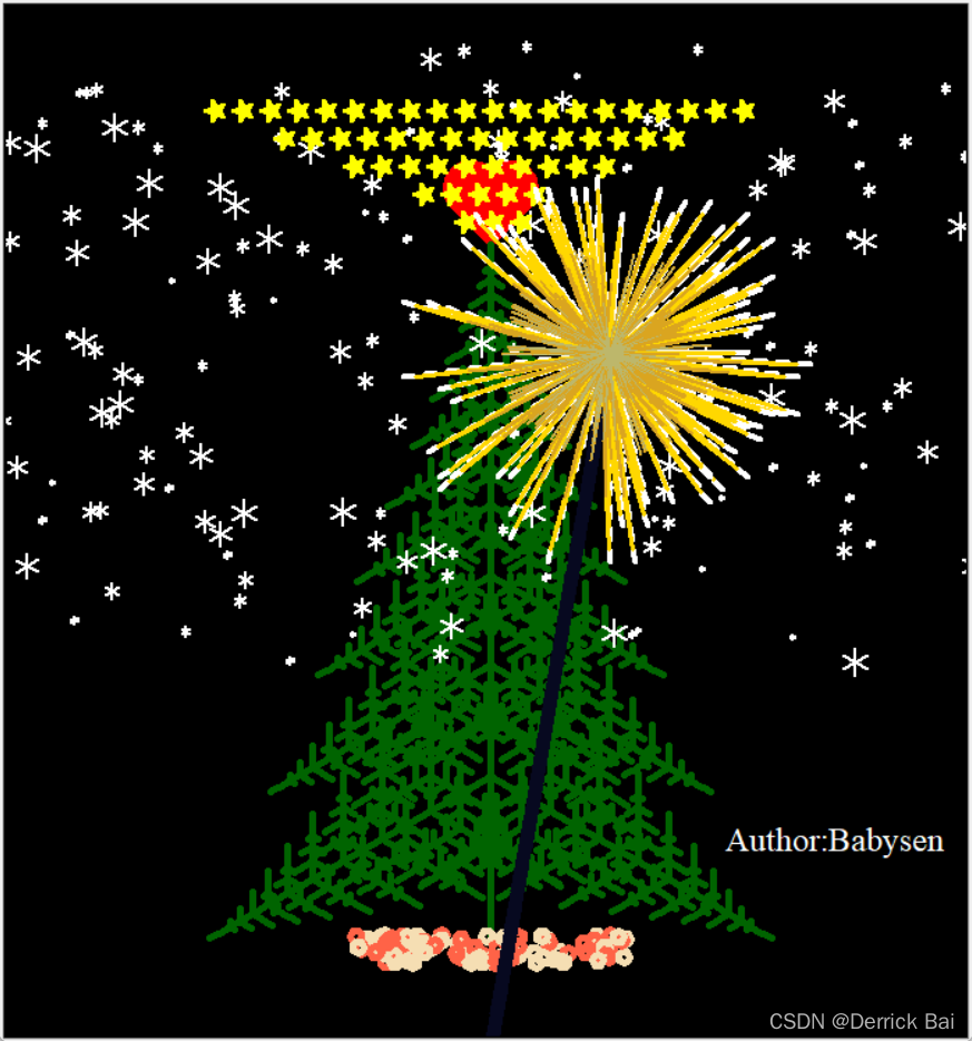 最近一直想让女朋友开心开心,眼看就到圣诞了,就想着来个不一样的,给她画个圣诞树玩一玩,也算是自己亲手做的,用了心思了。看了关于画圣诞树的很多博客,人才确实很多啊,鄙人不才,也加了点自己的创意。主要就是圣诞树和烟花两个部分,圣诞树里面的元素包含爱心,树,雪花,星星,署名,落叶等;烟花这边也是直接用的别人的程序进行了部分改动。本人将圣诞树和烟花相结合进行了绘制,话不多说,代码如下,赶紧给你的心仪之人吧
