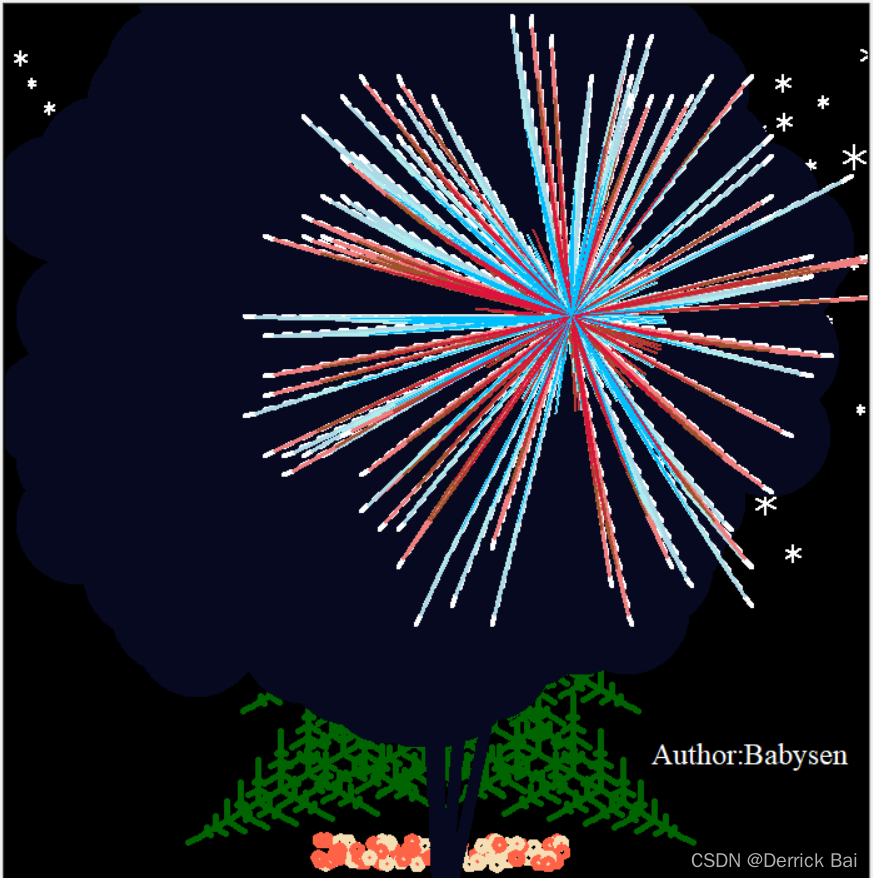 最近一直想让女朋友开心开心,眼看就到圣诞了,就想着来个不一样的,给她画个圣诞树玩一玩,也算是自己亲手做的,用了心思了。看了关于画圣诞树的很多博客,人才确实很多啊,鄙人不才,也加了点自己的创意。主要就是圣诞树和烟花两个部分,圣诞树里面的元素包含爱心,树,雪花,星星,署名,落叶等;烟花这边也是直接用的别人的程序进行了部分改动。本人将圣诞树和烟花相结合进行了绘制,话不多说,代码如下,赶紧给你的心仪之人吧!时间仓促,大家千万别嘲笑哈,祝大家一切顺利!使用前记得改署名呦!