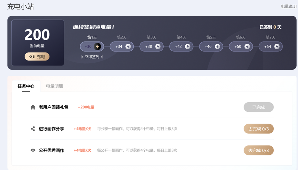 由于每次生成图片需要消耗电量,可以每天签到可以领取“电量”。