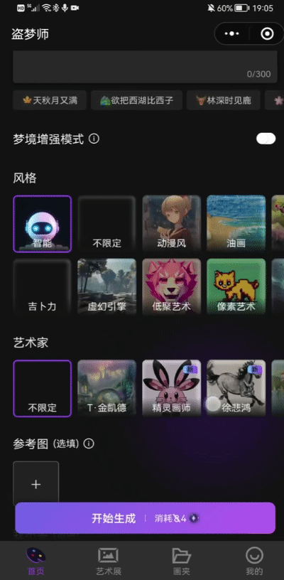 盗梦师是一个小程序AI作画工具。它是西湖心辰联合西湖大学深度学习实验室最新发布的一款AI绘画小程序。相当于你仅仅只需要在手机上输入几个关键字,就可以生成对应的图片。比其他工具都要方便很多。