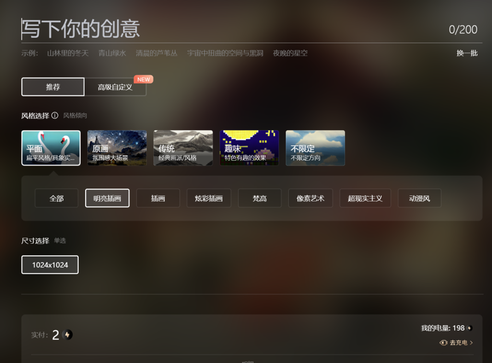 - 1.比较容易上手和操作。通过简单的输入几个文字,在推荐模式下等到1-2分钟就可以出图了。