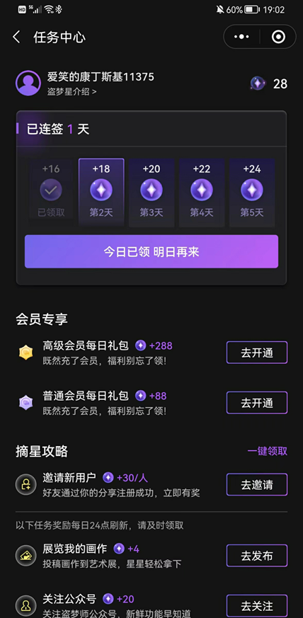 目前生成一张图片仅需要消耗4个币就可以,同时也可以每天进行打卡累积货币:
