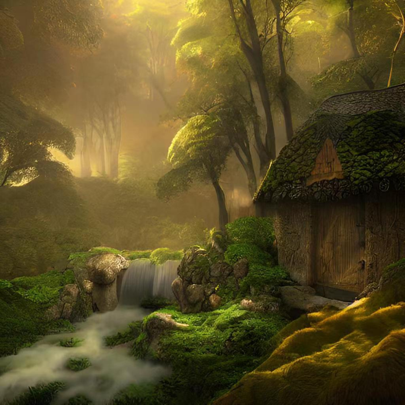 还有输入“雾气弥漫的森林,中世纪风格霍比特人村庄,阳光,原始丛林,瀑布,溪流,桥梁”,生成的画面中能够把所有提到的元素有效的融合在一起: