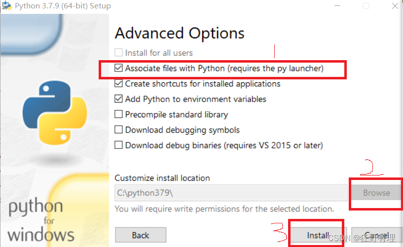 【3】如---图4,勾选Associate files with Python。正常情况下Install for all users,也应该勾选。这里不能勾选(原因是有残余的python垃圾未清理干净)这里不能勾选,可以先不管,修改Browse(安装路径),点击Install安装即可。