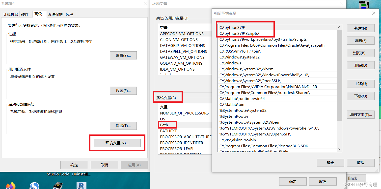 (2)如---图6,点击环境变量,找到系统变量下的Path,点进去后如果没有红框里面那两个路径(C:\python379\和C:\python379\Scripts\),将其添加进去(点击新建进行添加)