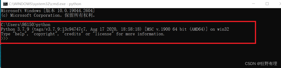 【2】快捷键 Windows +R,cmd进入系统控制面板。输入python,回车(enter),显示出所下载的python版本信息。如---图9,已成功安装。
