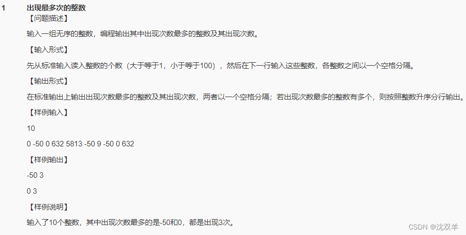 我的考试题目:我的解答:a = input('请输入整数的个数')b = input("请输入一组无序的整数,用空格分隔").split()c = list(map(int, b))e = []for i in c:d = c.count(i)e.append(d)f=max(e)g = e.index(f)h = c[g]print("输入了{}个整数,其中出现次数最多的是{},共出现{}次".