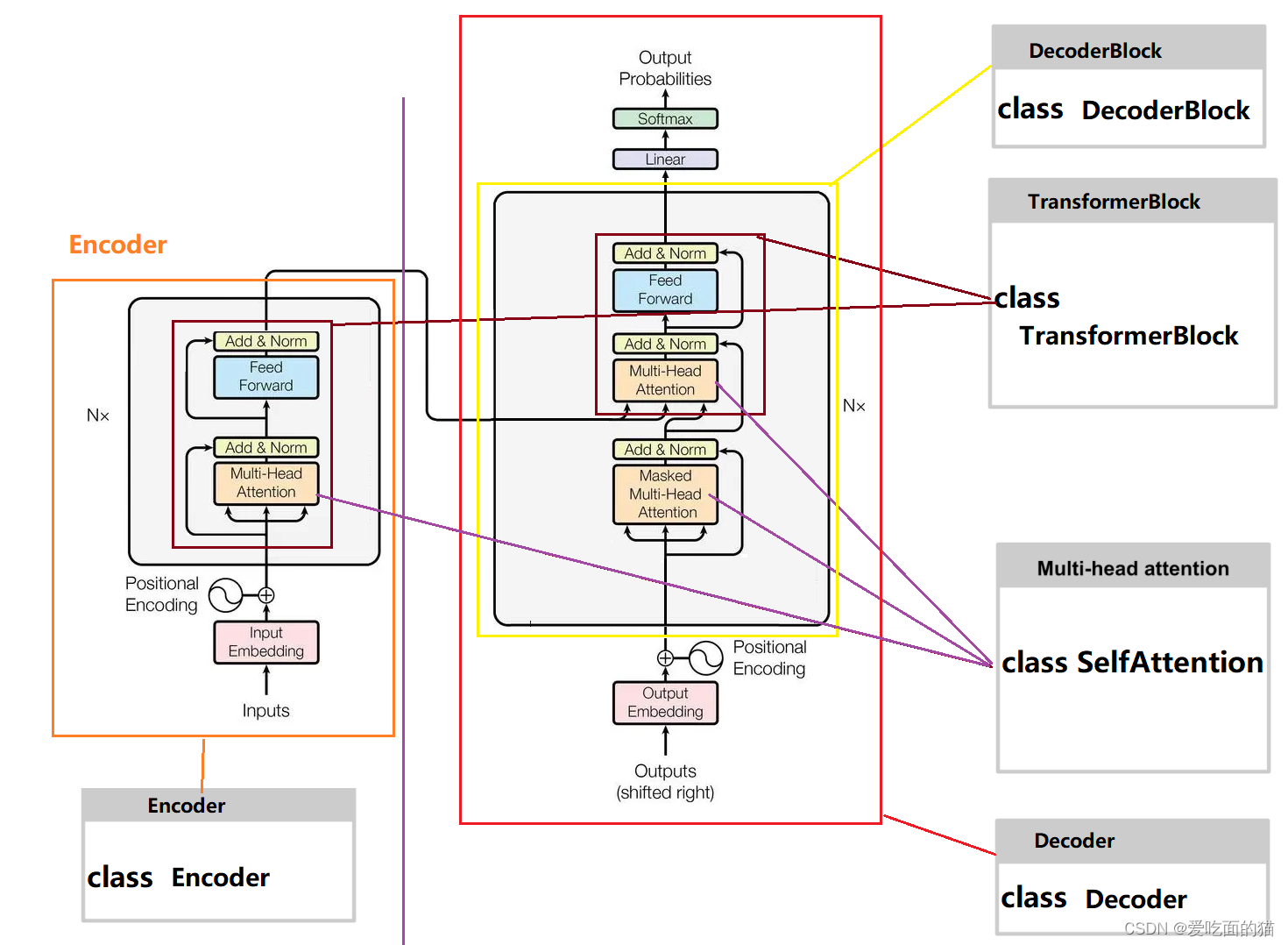 定义 注意力类 SelfAttention(紫色部分:注意力、多头注意力、掩码注意力)