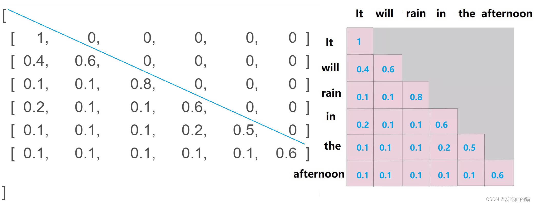 模型首先根据前文的语境,给预测出一个单词 It,但需要给出的长度是6,此时只有一个单词,因此 第一个单词“It”和自身attention,其他的5个位置没有内容,使用-inf掩盖。将之前的语境和It作为输入,预测出下一个单词是will,will会和It进行attention,同时也会和自己attention。依次类推,直到预测出 afternoon,它会和前面所有的单词进行attention再和自己attention。如下图所示: