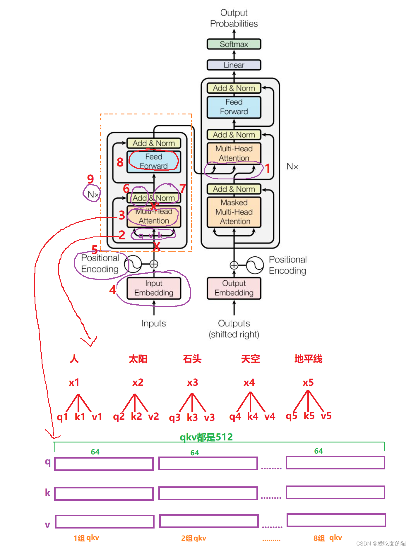 为方便大家理解Transformer模型,我们按照序号 1、2、4、5、6、7、8、9的顺序进行讲解。