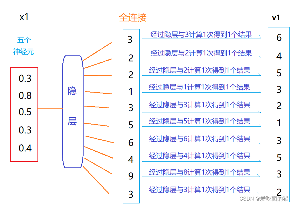 此时给出一个全连接层,假设全连接层是10个值【3,2,2,1,3,5,6,4,9,3】,使用卷积神经网络,将词向量 x1= [0.3,0.8,0.5,0.3,0.4] 作为一个输入,那么有五个神经元,五个神经元经过隐层后与【3,2,2,1,3,5,6,4,9,3】中的每个数分别计算一次,每次得到一个结果,最总得到10个结果假设是 [6,4,5,3,2,1,3,5,3,2],这个值就是v1。用同样的方式,我们可以计算得到 v2、v3、v4、v5。