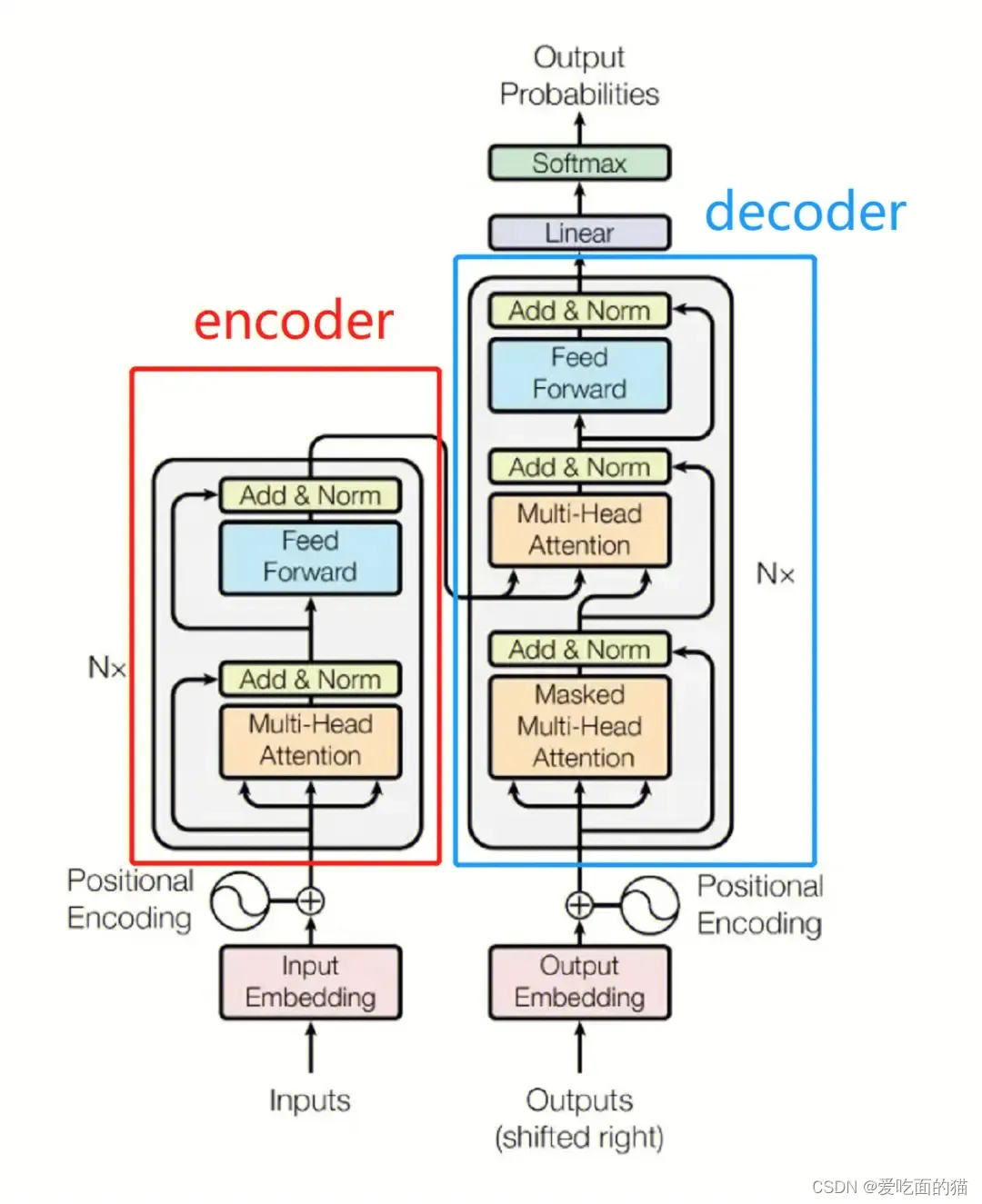 学习Transformer之前我们先看一下作者论文中的模型,如下图所示:本章内容主要是自己学习笔记,在学习过程中总结和整理,希望对各位有所帮助。本章学习从基础模型 Transformer 拆解,分析整个 Transformer 架构用到哪些模块,再把整个 Transformer 拼接起来。同时,图中的位置编码、矩形 和 Nx又是什么?这些模块又如何搭建起来呢?当真的有一个任务,又如何使用和完成的?