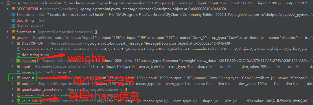 如二中导出的onnx模型,只有最上层输入的shape,如果想知道每一层数据流的变化,需要借助onnx.shape_inference, 读取上一步的onnx模型,再重新保存一遍。