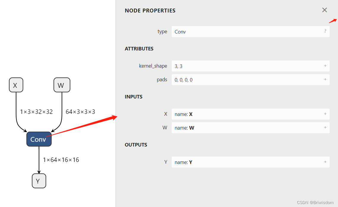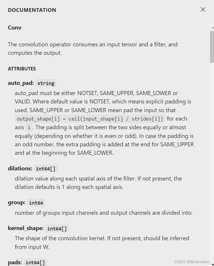 使用netron工具可视化刚才保存的onnx模型,如图,点击conv的问号,会在右边出来onnx内部对这个node的解释和示例。