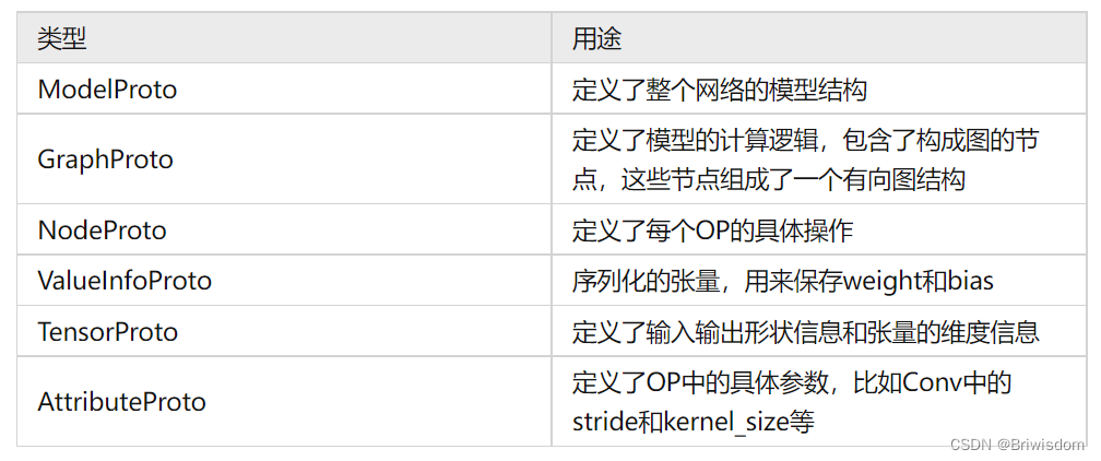onnx模型包含如下几个protobuf,定义如下。在工程实践中,导出一个ONNX模型就是导出一个ModelProto。ModelProtp中包含GraphProto、版本号等信息。GraphProto又包含了NodeProto类型的node,ValueInfoProto类型的input和output,TensorProto类型的initializer。其中,node包含了模型中的所有OP,input和output包含了模型的输入和输出,initializer包含了所有的权重信息。 每个计算节点node中还包含了一个AttributeProto数组,用来描述该节点的属性,比如Conv节点或者卷积层的属性包含group,pad,strides等等。
