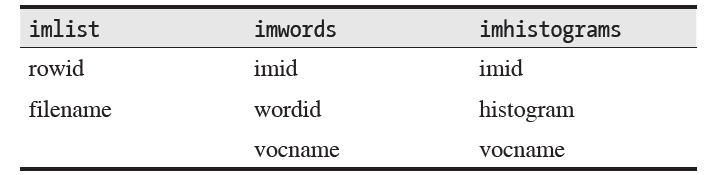 使用pickle模块将数组编码成字符串以及将字符串进行解码,SQLite可以从sqlite3模块中导入,上述方法存在indexer类中,创建之后就可以保存词汇对象。__del__()方法确保关闭数据库连接,db_commit()可以将更改写入数据库文件。