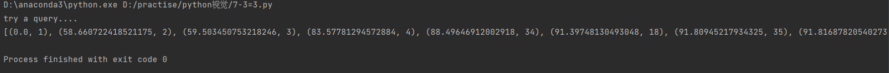query()方法获取图像的文件名,检索其单词直方图及候选图像列表。对于每一个候选图像,我们用标准的欧式距离比较他和查询图像间的直方图,并放回一个经排序的包含距离及图像的id的元组列表。