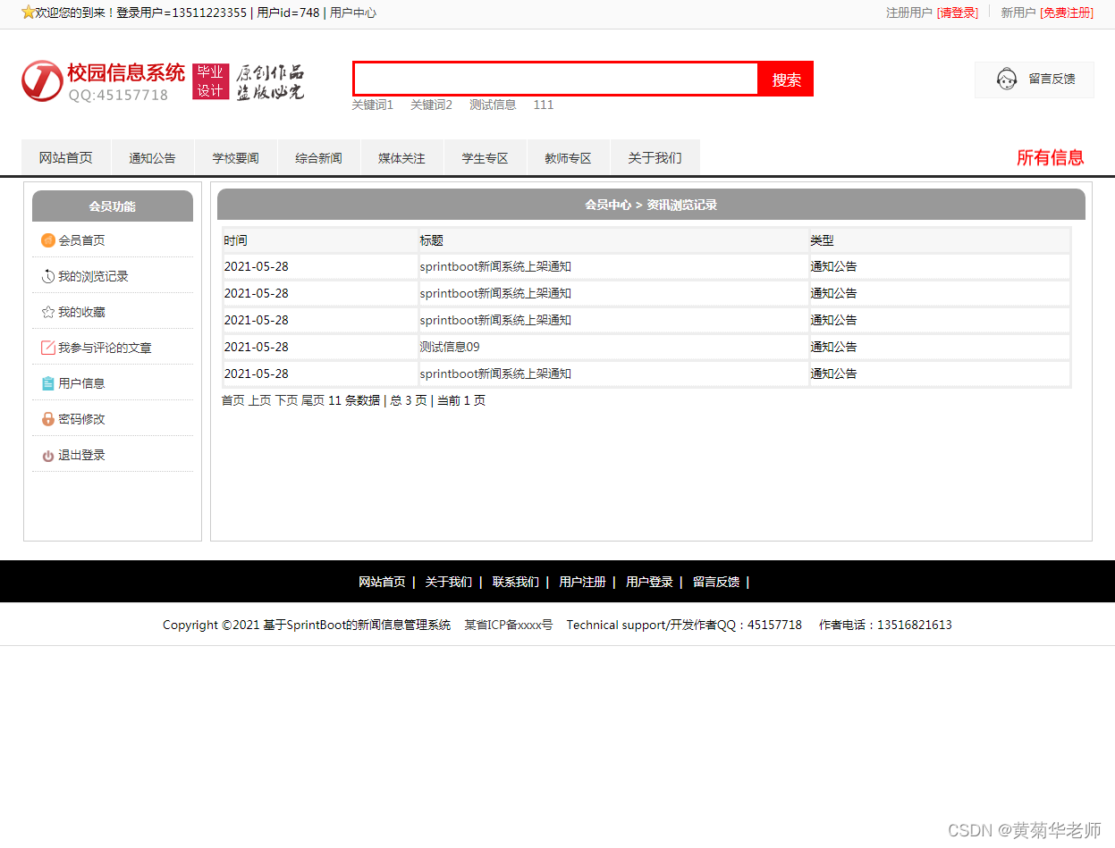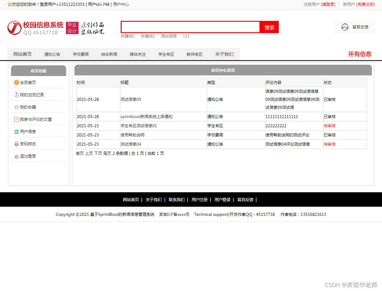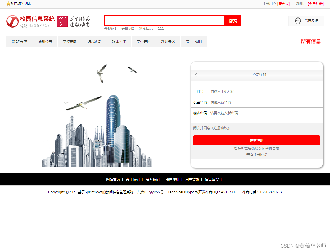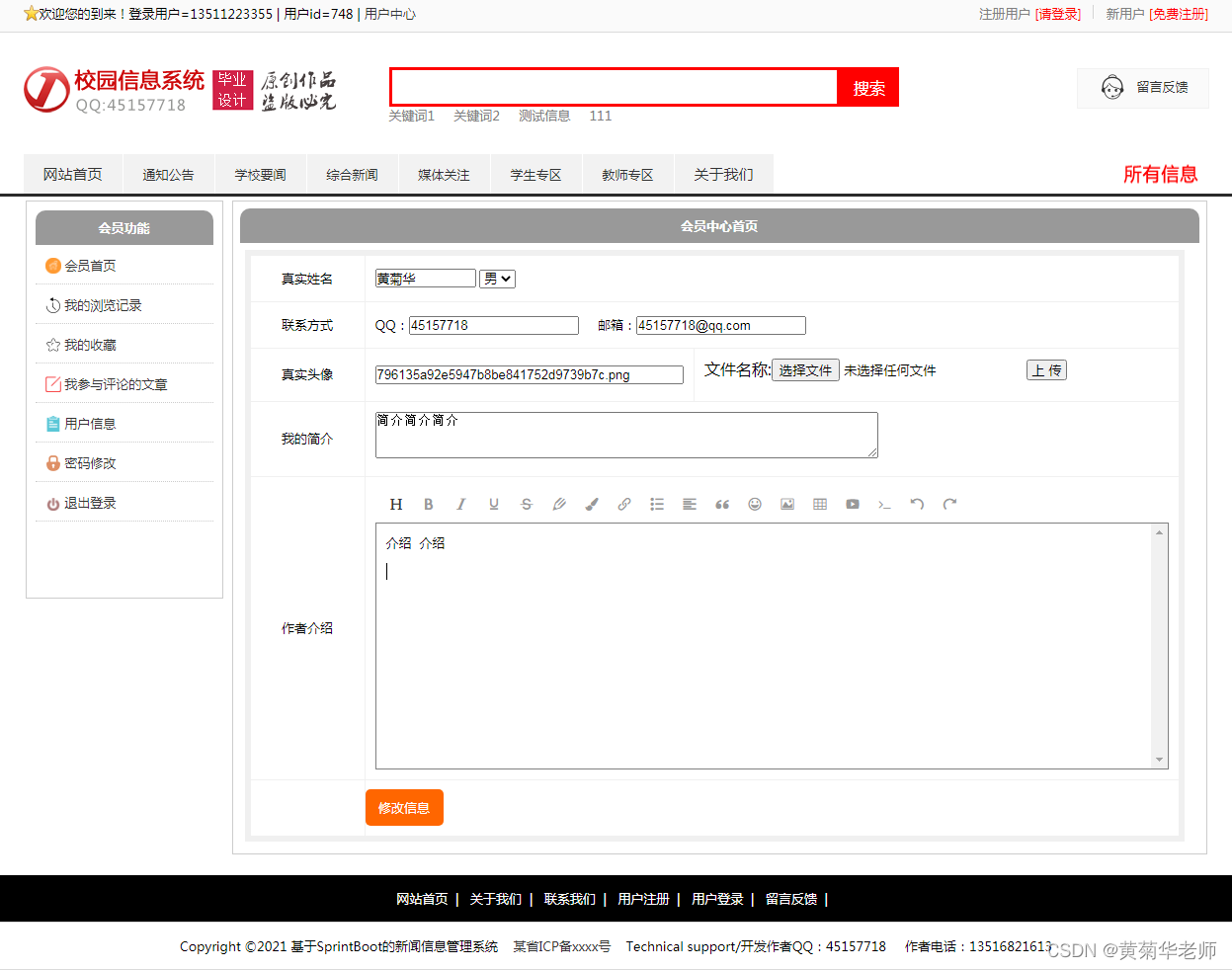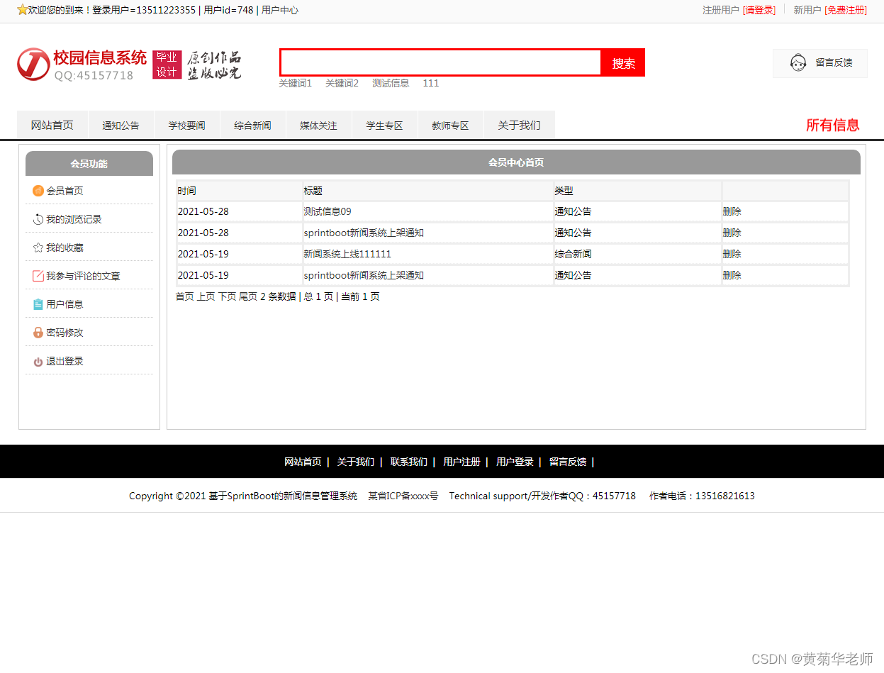 用户注册:填写手机账号和密码,注册新用户 登录功能:注册普通账号登录;登录后可以修改用户的基本信息,也可以退出。 关于我们:学校简介、关于我们、联系我们、加入我们、法律声明、学校详情 轮播广告:后台设置首页轮播广告图,可以连接到广告页面。 留言反馈:用户填写李哭咽的主题、联系人、电话、邮箱、留言内容;后台管理可以查看留言列表,可以删除留言。 校园风光列表:显示所有校园风光,可以点击左侧校园风光分类筛选 校园风光信息:游客和用户都可以进行查看校园风光信息。 校园风光收藏:查看到有兴趣的校园风光,注册登录的用户可以进行收藏操作。 校园风光评论:查看到有兴趣的校园风光,登录的用户,可以发表评论;后台审核后显示 分院介绍:列出学校所有分院、可以点击查看详情查看 分院选修课:按分院列出安排的课程表 选修课报名:选修课课程表,自动判断是否和当前学员必修课是否冲突 老师中心:列出学校所有老师,尅点击查看详情了解老师信息 学校课程:列出学校所开设所有课程,点击课程详情可以查看课程 班级信息:列出学校开设的所有班级信息,可以点击查看班级信息了解班级信息 班级排课:每个班级信息右侧,可以点击最终课程表,查看排课信息 资讯列表:显示所有资讯,可以点击左侧资讯分类筛选 资讯阅读:游客和用户都可以进行资讯的阅读。 资讯收藏:阅读到有兴趣的资讯,注册登录的用户可以进行收藏操作。 资讯评论:阅读资讯的时候,登录的用户,可以发表评论;后台审核后显示。 我的班级信息:新生报到的班级信息,里面有相关联系方式,地址等 我的必修课-课程表:新生报到所在班级的课程表,根据课程表上课 我的选修课-课表:自己选修的课程的课程表 学籍和宿舍信息:老师录入和安排的学籍和宿舍信息,个人信息可以在用户信息修改 用户信息:姓名、联系方式、邮箱、头像、简介、介绍等,支持随时修改;用户注册的信息后台管理员可见;后台管理员可以删除。 密码修改:修改注册的密码。 退出登录:清除登录的cookie,返回到首页。 |