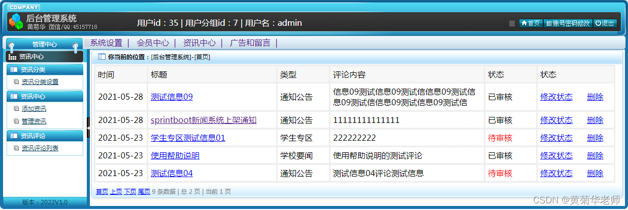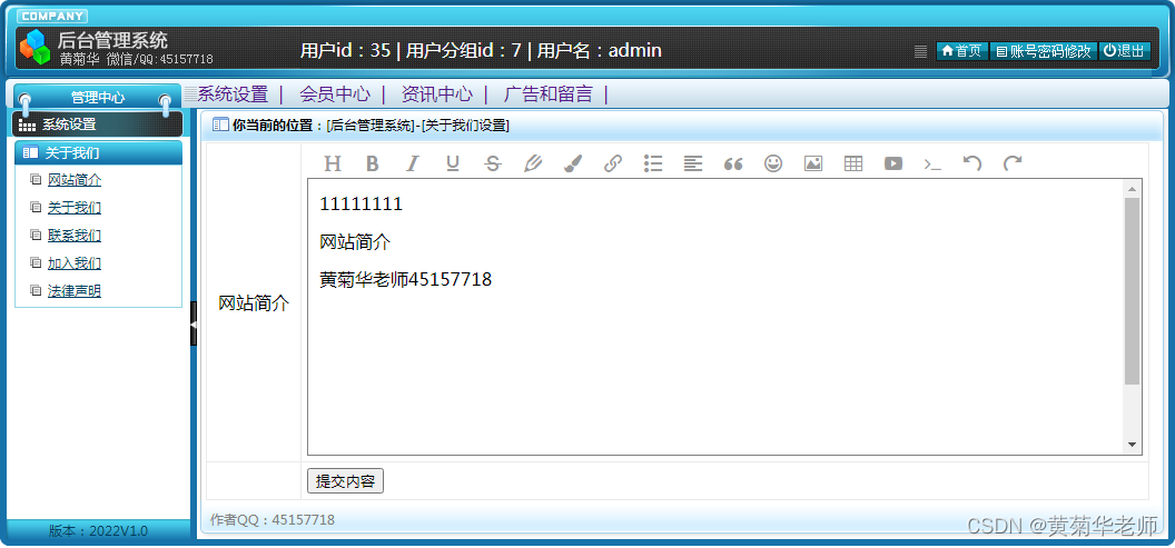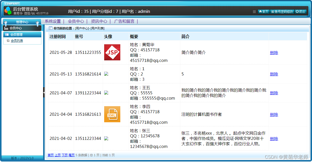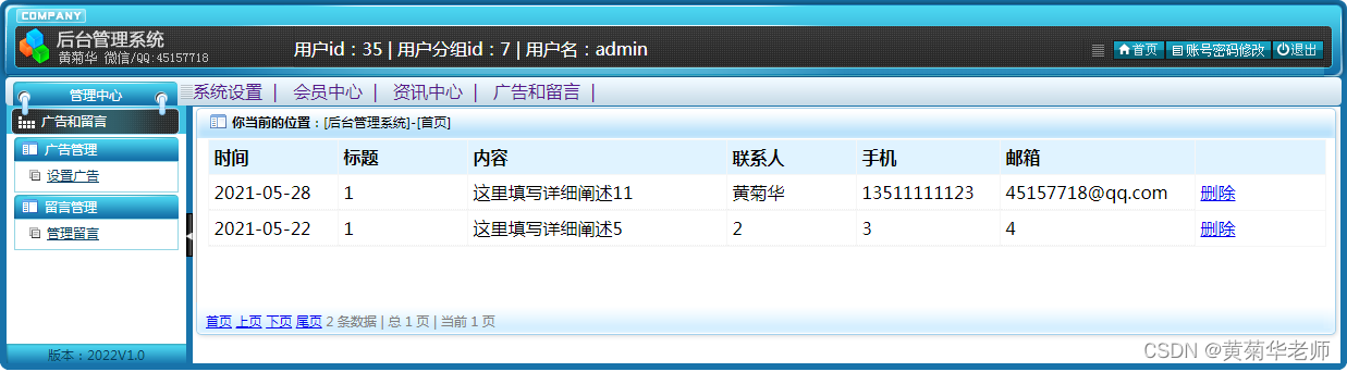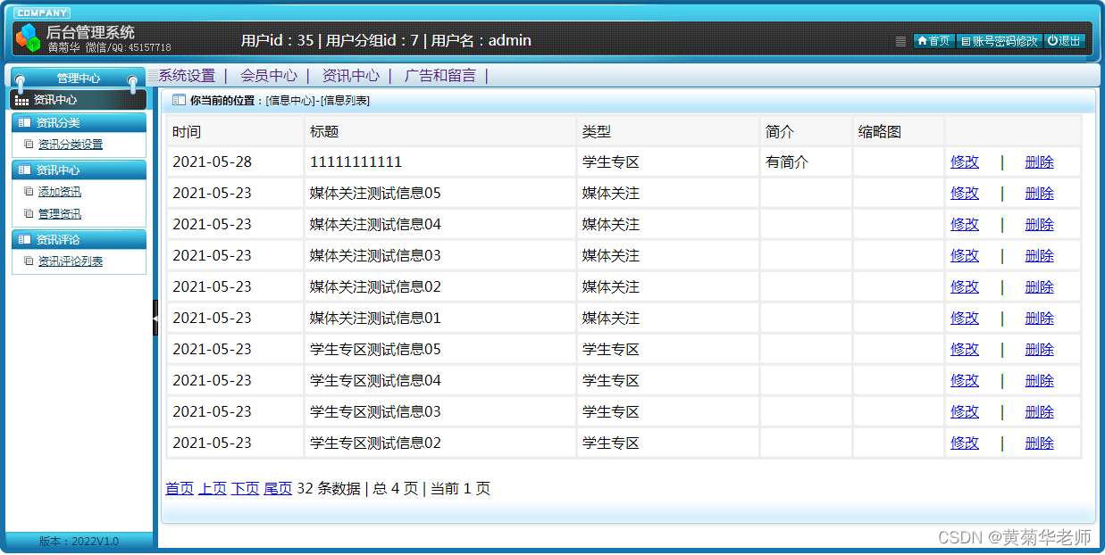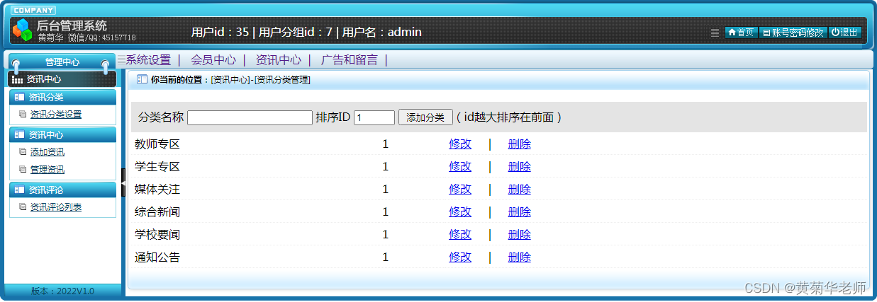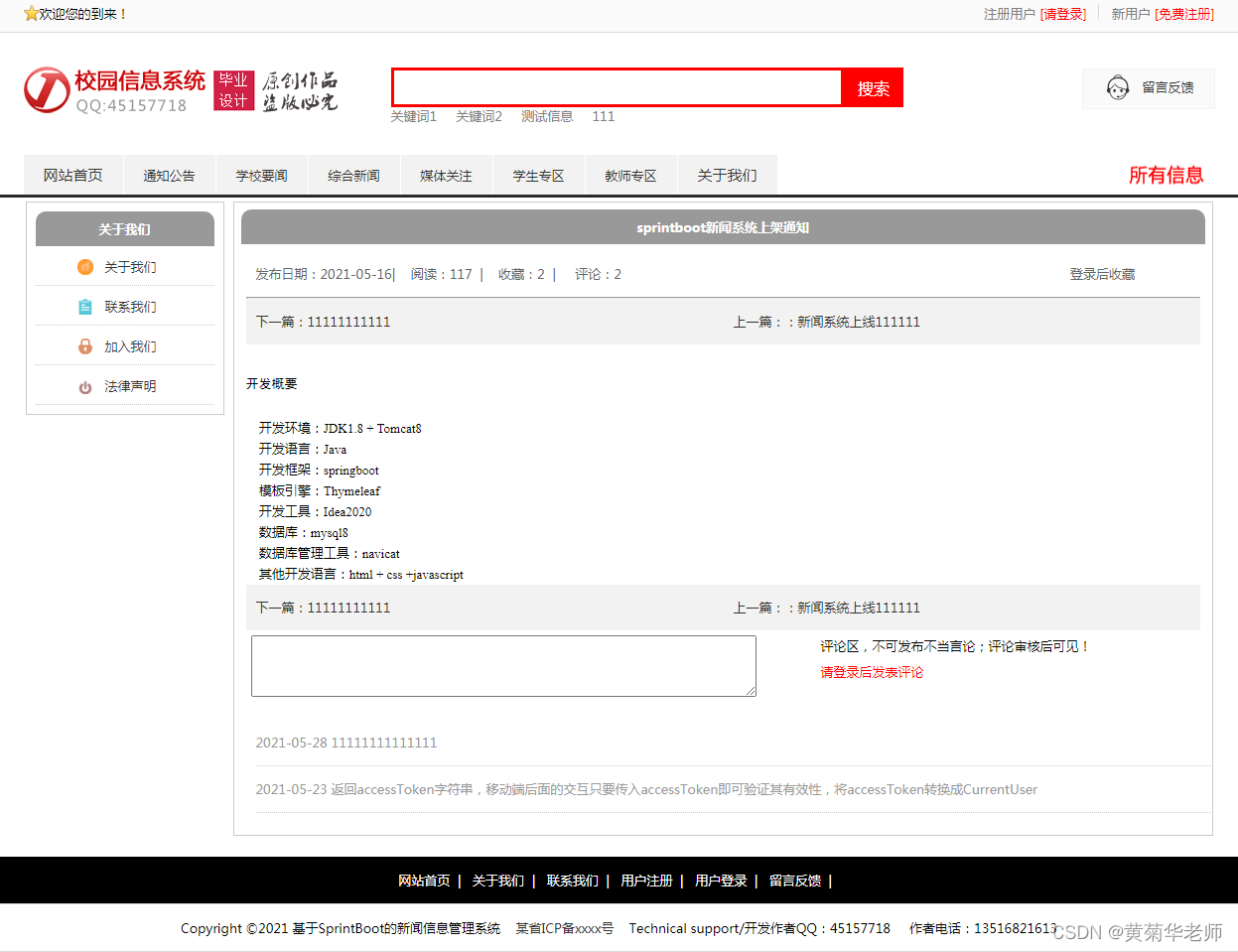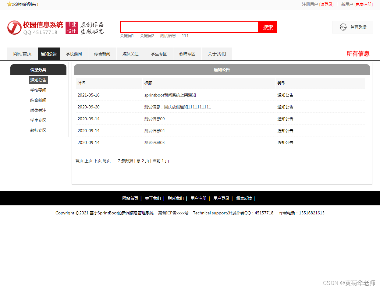 用户注册:填写手机账号和密码,注册新用户 登录功能:注册普通账号登录;登录后可以修改用户的基本信息,也可以退出。 关于我们:学校简介、关于我们、联系我们、加入我们、法律声明、学校详情 轮播广告:后台设置首页轮播广告图,可以连接到广告页面。 留言反馈:用户填写李哭咽的主题、联系人、电话、邮箱、留言内容;后台管理可以查看留言列表,可以删除留言。 校园风光列表:显示所有校园风光,可以点击左侧校园风光分类筛选 校园风光信息:游客和用户都可以进行查看校园风光信息。 校园风光收藏:查看到有兴趣的校园风光,注册登录的用户可以进行收藏操作。 校园风光评论:查看到有兴趣的校园风光,登录的用户,可以发表评论;后台审核后显示 分院介绍:列出学校所有分院、可以点击查看详情查看 分院选修课:按分院列出安排的课程表 选修课报名:选修课课程表,自动判断是否和当前学员必修课是否冲突 老师中心:列出学校所有老师,尅点击查看详情了解老师信息 学校课程:列出学校所开设所有课程,点击课程详情可以查看课程 班级信息:列出学校开设的所有班级信息,可以点击查看班级信息了解班级信息 班级排课:每个班级信息右侧,可以点击最终课程表,查看排课信息 资讯列表:显示所有资讯,可以点击左侧资讯分类筛选 资讯阅读:游客和用户都可以进行资讯的阅读。 资讯收藏:阅读到有兴趣的资讯,注册登录的用户可以进行收藏操作。 资讯评论:阅读资讯的时候,登录的用户,可以发表评论;后台审核后显示。 我的班级信息:新生报到的班级信息,里面有相关联系方式,地址等 我的必修课-课程表:新生报到所在班级的课程表,根据课程表上课 我的选修课-课表:自己选修的课程的课程表 学籍和宿舍信息:老师录入和安排的学籍和宿舍信息,个人信息可以在用户信息修改 用户信息:姓名、联系方式、邮箱、头像、简介、介绍等,支持随时修改;用户注册的信息后台管理员可见;后台管理员可以删除。 密码修改:修改注册的密码。 退出登录:清除登录的cookie,返回到首页。 |