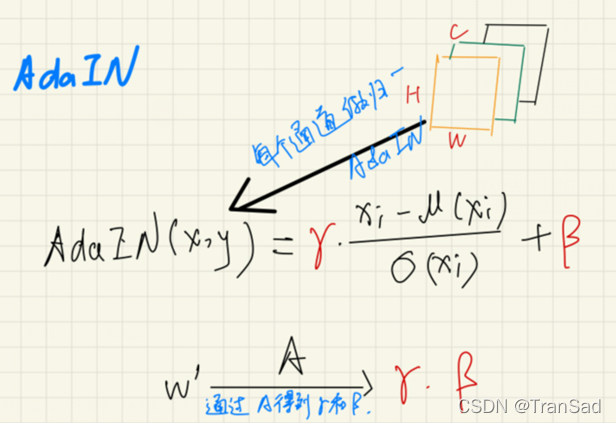 在图中我们可以看到:每次作用时,W’都会先经过一个过程“A”处理,这里的A其实就是一个全连接层,我们将W’通过全连接层A变换(计算)出两个参数:γ和β,就可以拿去对(进行IN操作后的)特征层每个channel进行缩放,从而成为AdaIN。