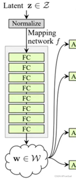 - (第2点在看完下面的AdaIN部分后再看会清楚一些) 如果直接用输入向量来送入生成网络的各个层去控制不同层次下的信息,会有“特征纠缠”的现象。这个现象简单来说会导致:当我们想控制低层次下的粗略信息时,也会影响到高层次下的细微信息,会有“牵一发而动全身”的效果——显然我们不想这样做,我们就想不同层次各自控制各自的。而通过这么一个Mapping Network我们就可以让处理后的输入数据不会有这个现象。
