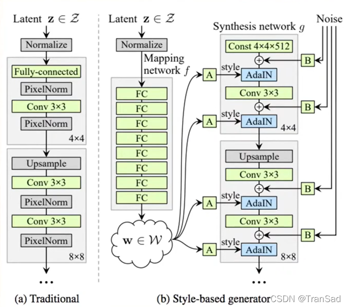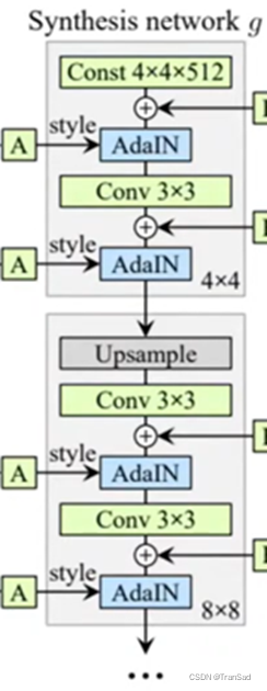从上图可以看到,传统的生成器的输入就是直接用高斯分布下512维的随机向量。而Stylegan中使用了8层全连接网络Mapping network来进一步处理输入,将它映射到另一个512维,并未改变其维度。此外,我们可以发现传统的生成器输入数据只送到了第一层;而在StyleGAN中,通过Mapping Network处理之后的W’会陆续地影响很多层,这是用来控制不同层次下的样式的。这一点在下面的AdaIN部分再细讲。