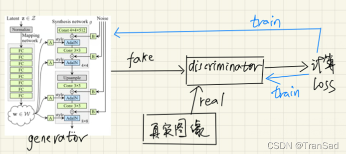 最后再提一下,上面的我写的几个要点其实都和生成器相关。我们整体的StyleGAN模型还有判别器呢,整个StyleGAN大概是这样: