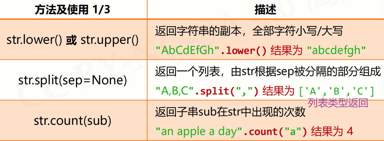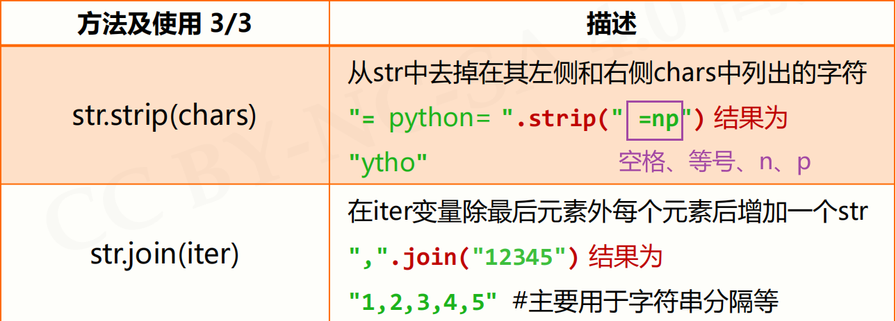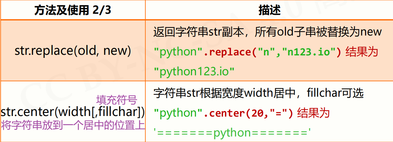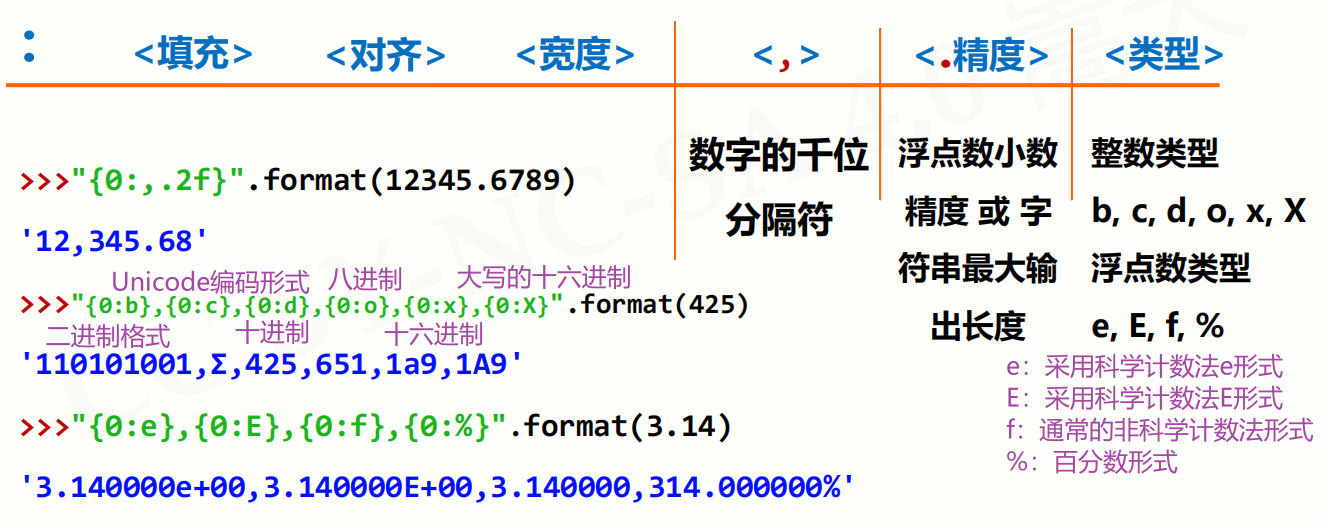 - 字符串格式化使用 .format() 方法,用法:<模板字符串>.format(<逗号分隔的参数>)