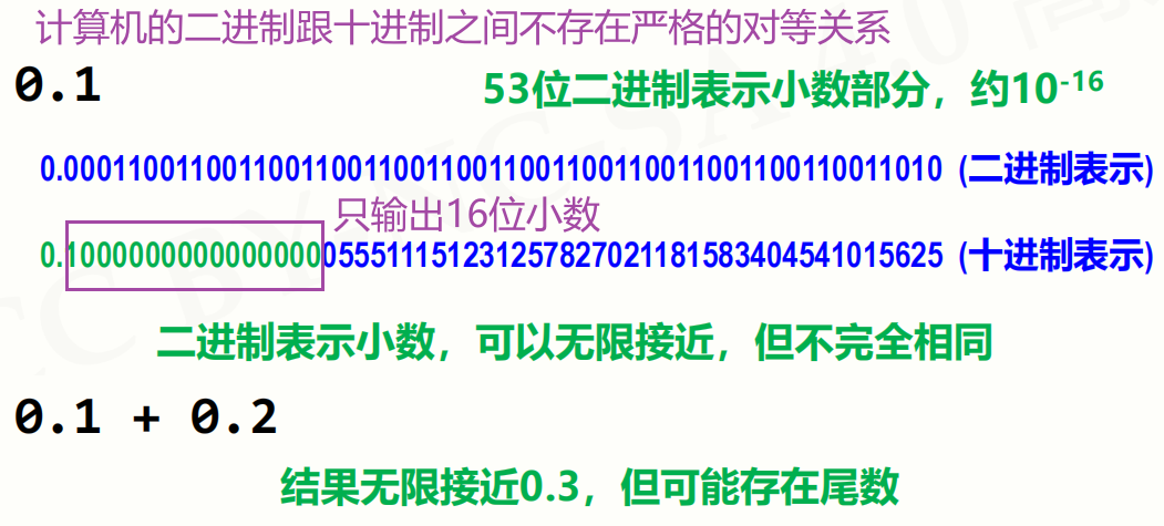 - 浮点数取值范围(数量级约-10的308次方到10的308次方)和小数精度(数量级10的-16次方,即两个小数间的差别最小可以表示到10的-16次方)都存在限制,但常规计算可忽略
