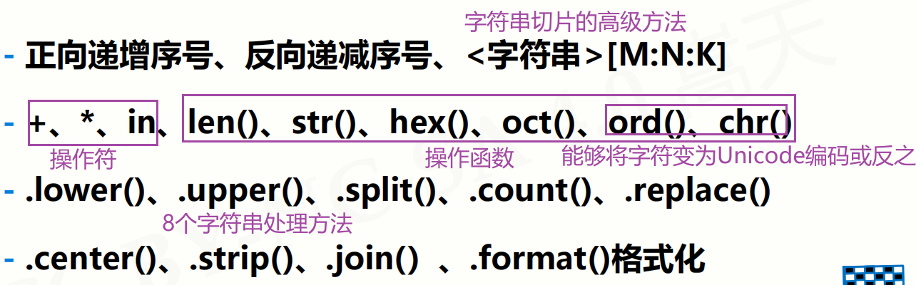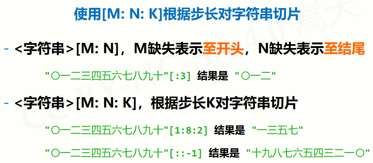 - 切片:返回字符串中一段字符子串 <字符串>[M:N]