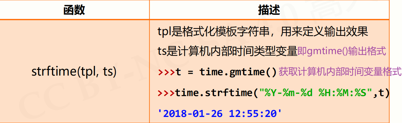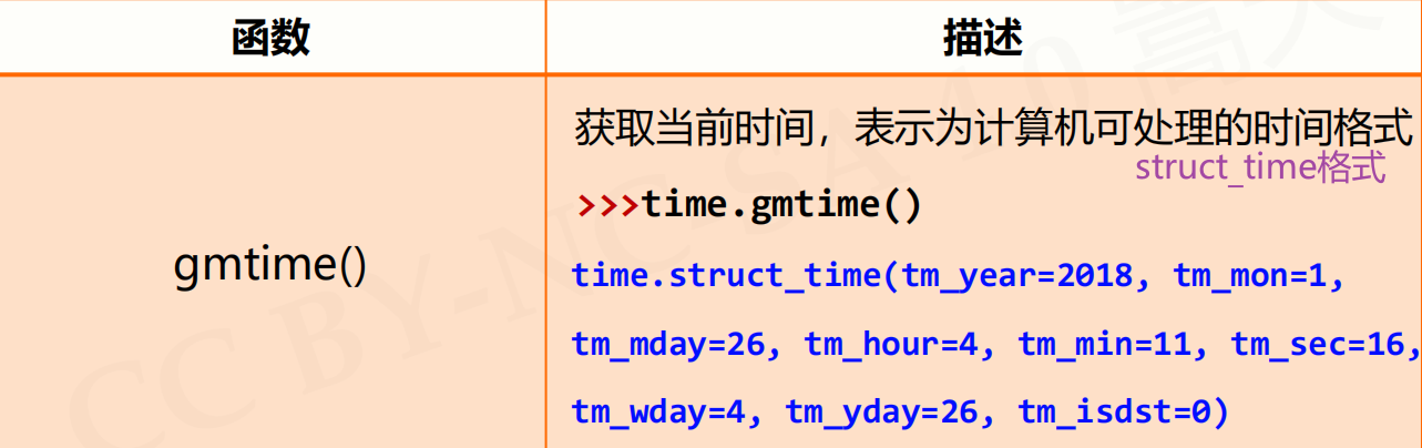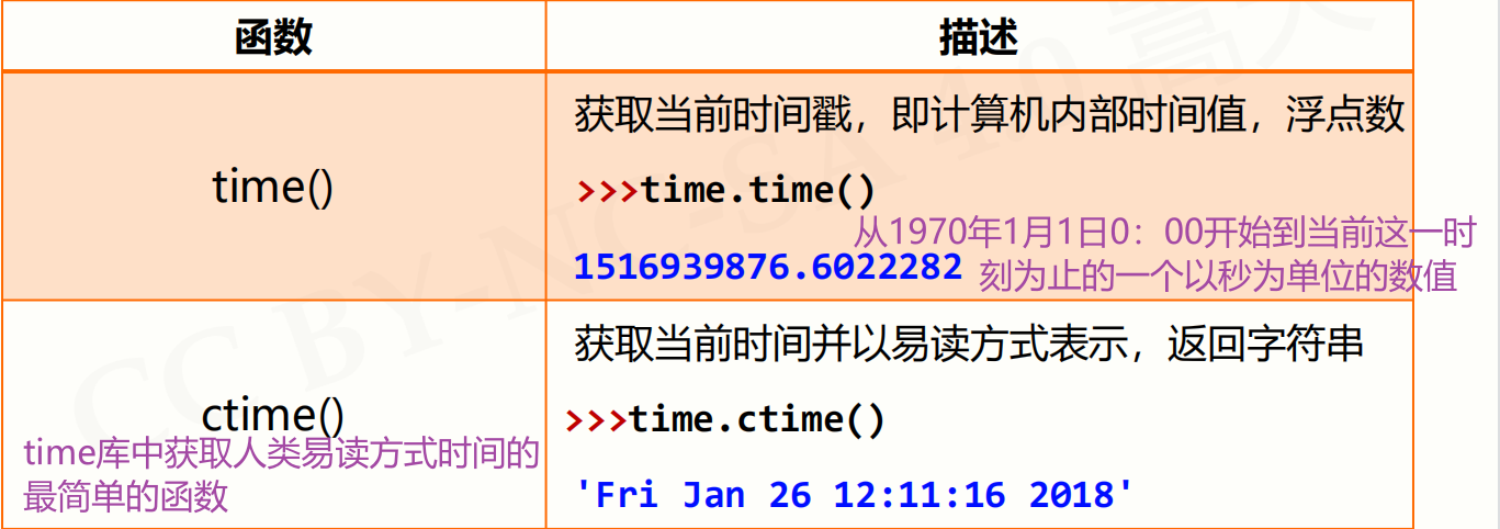 - 三个获取时间的函数:time()获得浮点数、ctime()获得程序员可读的字符串类型的时间、gmtime()获得一个时间变量,用来给其他程序提供时间参数