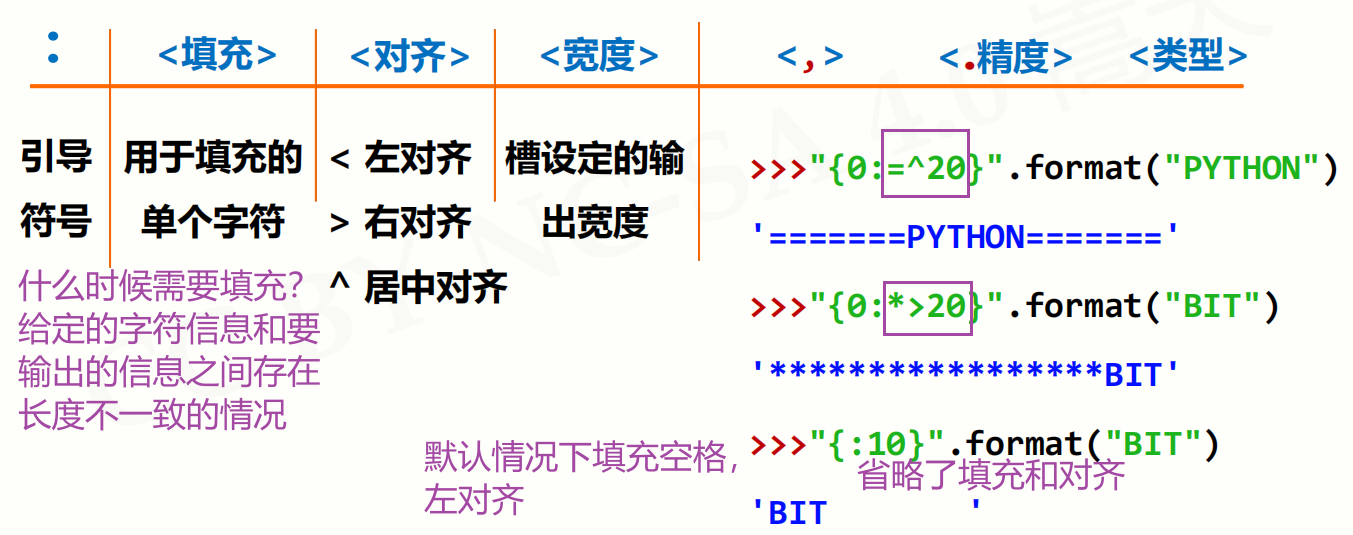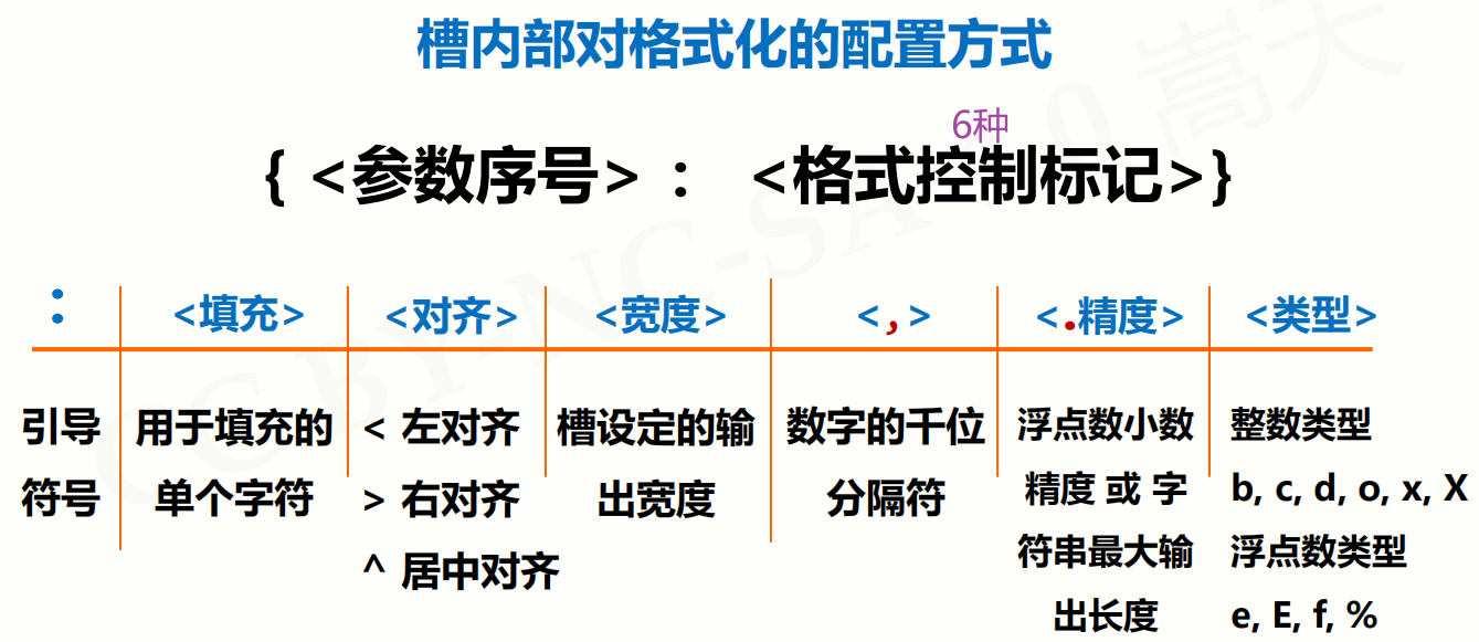 - 槽内部使用格式化的控制标记来进行格式控制,简单讲,在槽的内部,除了槽的参数序号之外,可以通过一个 : 来引导参数,控制某一个变量在槽位置的输出格式