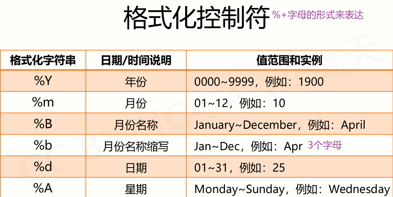 - 将时间以合理的方式展示出来,类似于字符串的格式化(.format()方法,需要一个模板字符串) ,时间格式化也需要展示模板