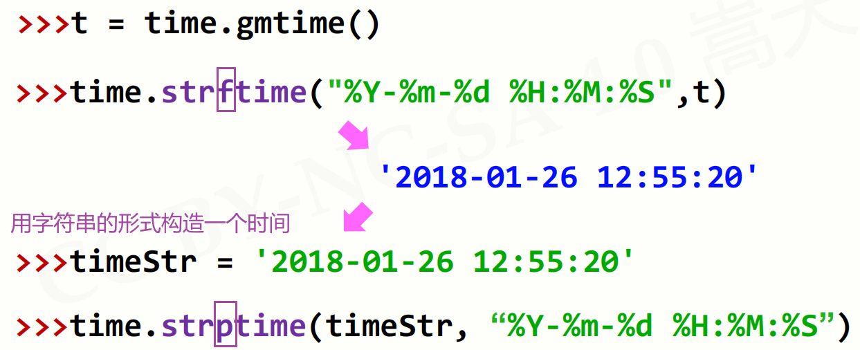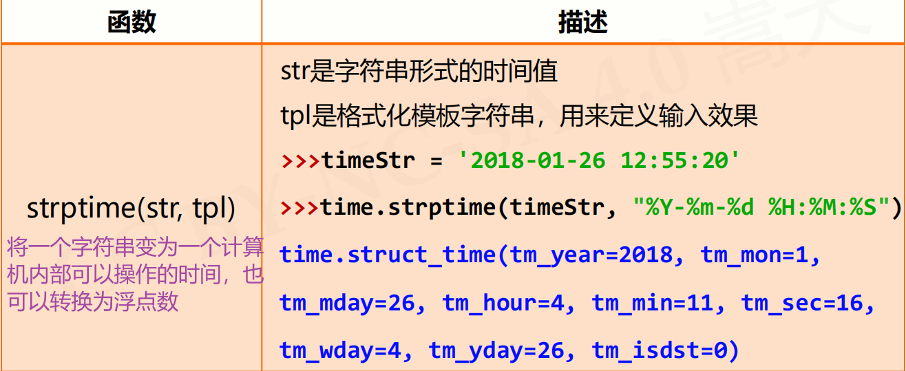 在计算机中为了表达时间,其实只有一个浮点数(1970年1月1日开始),为了让其他程序更好地处理这个浮点数,把它定义为一个程序可以理解的格式(即gmtime获取的struct_time格式,struct_time中包含了很多元素,这些元素的值都是通过浮点数来提取的)。反过来,我们也可以使用一个字符串赋予一个时间给我们定义的strptime类型,由这个类型进一步生成浮点数
