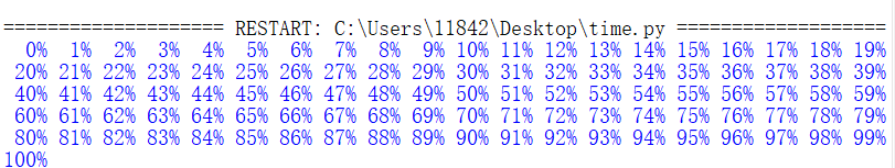 但上述代码在IDLE中运行,并不是单行刷新的效果,而是所有信息都被展示出来。因为IDLE为开发环境,为了保证其中参数运行的效果,将 \r 功能屏蔽掉了