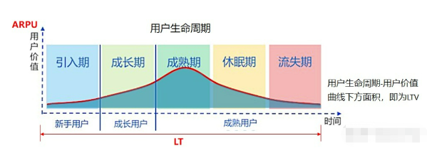 LTV=LT*ARPU(用户生命周期价值=用户的平均生命周期*单个用户的平均收益)