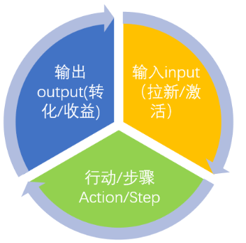 Growth Loops的步骤组成主要有三个:输入Input (拉新/激活)、行动/步骤Action/Step、输出Output (转化/收益)。