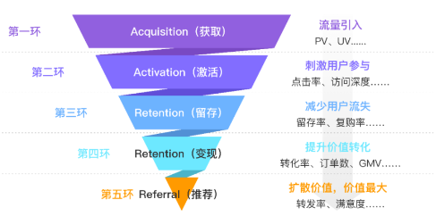 AARRR用户增长模型”是由该模型五个环节的首字母缩写组成,即Acquisition(获取)、Activation(激活)、Retention(留存)、Revenue(变现)和Referral(推荐)。
