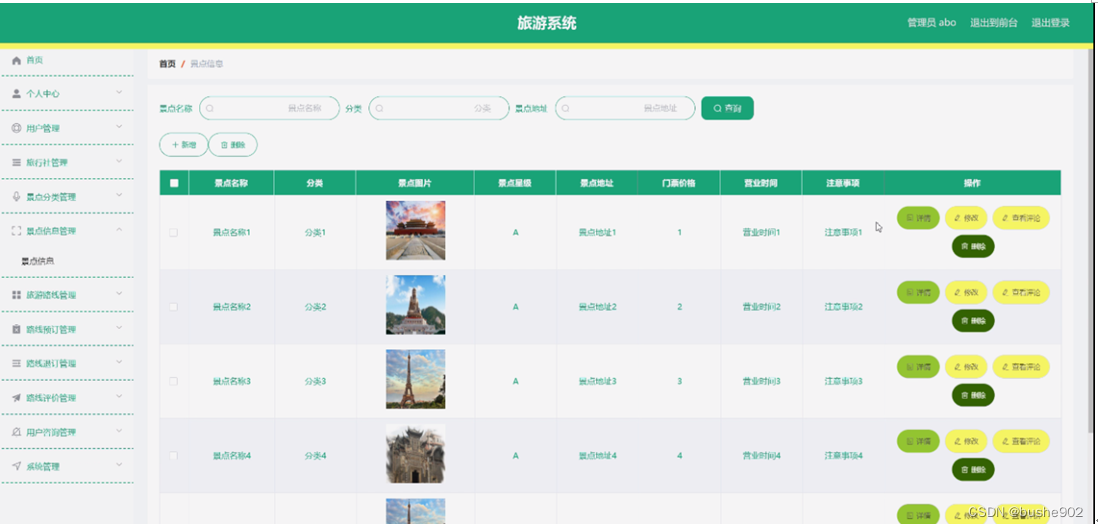 景点信息管理:在景点信息管理页面中可以查看景点名称、分类、景点图片、景点星级、景点地址、门票价格、营业时间、注意事项等内容,进行详情、修改、查看评论或删除等详细操作;如图5-11所示。