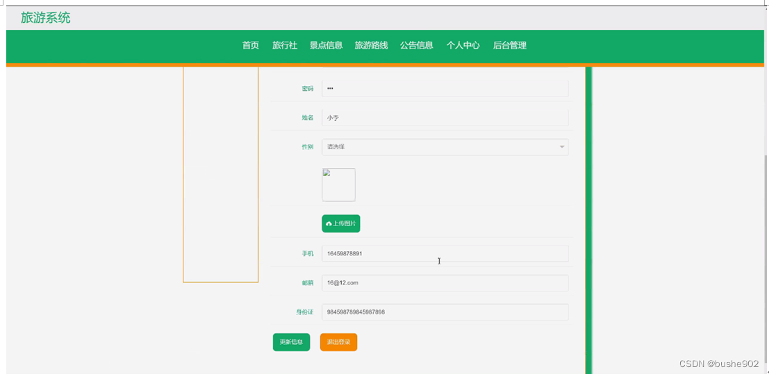 个人中心:在个人中心页面中输入用户名、密码、姓名、性别、图片、手机、邮箱、身份证等内容进行更新信息,并可以根据我的收藏进行相应的操作,如图5-5所示。