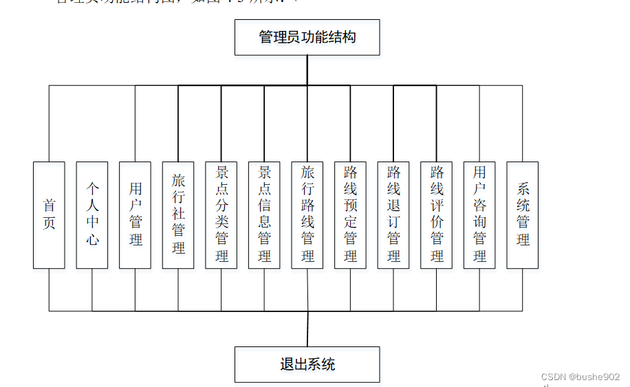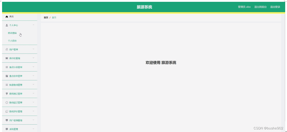 管理员;在管理员页面中可以查看首页、个人中心、用户管理、旅行社管理、景点分类管理、景点信息管理、旅行路线管理、路线预定管理、路线退订管理、路线评价管理、用户咨询管理;系统管理等信息,如图5-7所示。