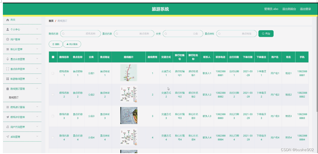 路线预定管理:在路线预定管理页面中可以查看路线名称、景点名称、分类、景点地址、路线图片、路线费用、交通方式、旅行社编号、旅行社名称、联系人、联系电话、出行日期、下单日期、下单备注、用户名、姓名、手机、身份证、是否支付、审核回复、审核状态等内容,进行详情、修改或删除等操作;如图5-13所示。